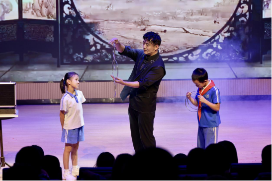 瞬息变换探索东方魔力。10月27日,慰问演出走进罗湖外语小学,严张高吉以“手彩魔术”惊艳开场,张林峰表演的《魔幻绳索》将小小绳索玩得出神入化;互动魔术《小小魔术师》邀孩子们现场体验,魔术教学《神奇的香蕉》引爆全场孩子的热情,迫不及待地解锁“隔空切香蕉”秘诀;辛亚飞表演的传统魔术《中国环》尽显东方古典幻术韵味。