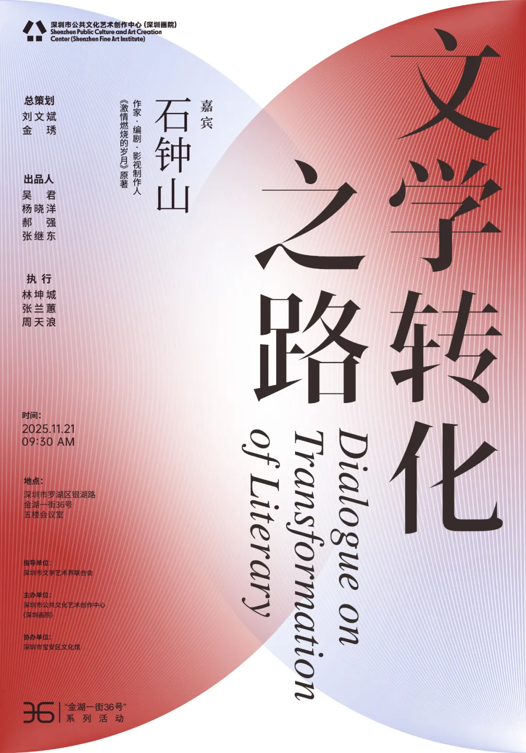 2025年11月21日上午,由深圳市文联指导,深圳市公共文化艺术创作中心(深圳画院)主办、深圳市宝安区文化馆协办的“文学转化之路”专题文学讲座在该中心举行。本次讲座特邀文学、影视跨界人物——著名作家、编剧、影视制作人石钟山主讲。深圳市评协副主席、著名影评人王樽担任学术主持。活动现场为文学爱好者、编剧从业者及文艺工作者提供了一场兼具实操经验与开启思维的文化盛宴。