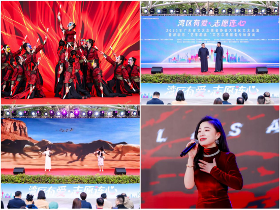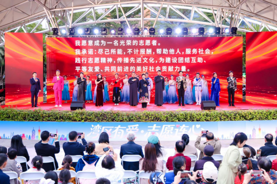 中国文艺志愿者协会副主席、广东文艺志愿者协会主席、汉剧表演艺术家李仙花作为领誓人,带领全体演员庄严宣誓,表达了文艺工作者扎根基层、服务群众的坚定决心。最后,演出在主题歌《湾区大爱 志愿连心》中落下帷幕,姜婷婷、李思音等四位歌唱家联袂演唱,传递出湾区同心、志愿同行的深厚情谊。