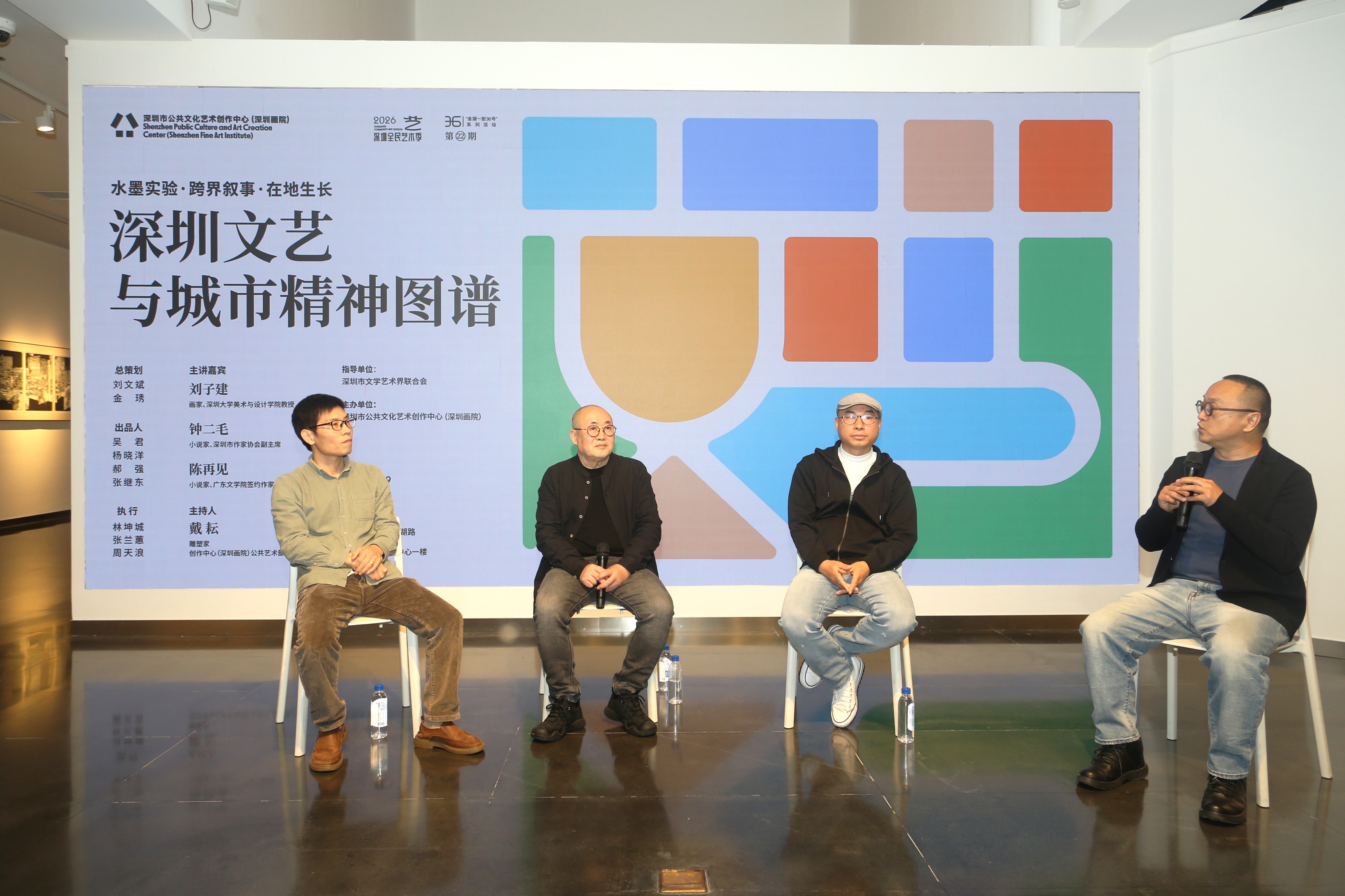 2026-011月19日,由深圳市文联指导、深圳市文艺创作中心(深圳画院)主办的第22期“金湖一街36号”文艺活动在深圳市文艺创作中心如期举行。作为“2026深圳全民艺术季”的重要组成部分,这场以“水墨实验・跨界叙事・在地生长:深圳文艺与城市精神图谱”为主题的跨界对话,汇聚了实验水墨画家、深圳大学美术与设计学院教授刘子建,小说家、深圳市作家协会副主席钟二毛,小说家、广东文学院签约作家陈再见三位深耕深圳文艺的创作者,在雕塑家、创作中心公共艺术部主任戴耘的主持下,共话艺术坚守与时代变革中的城市精神表达。