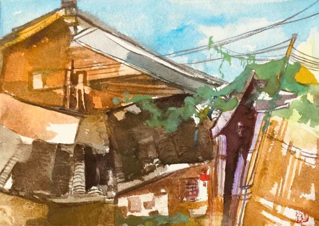 颜晓萍《有光斑的老屋》60cm×60cm 纸本水彩 2024年