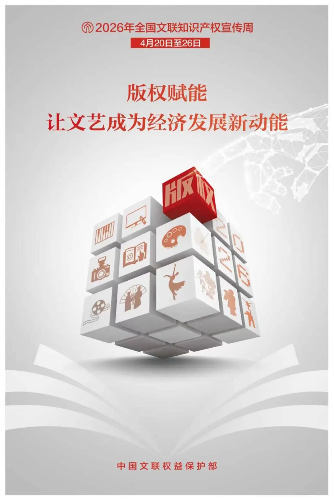 在第26个世界知识产权日来临之际,一年一度的“全国文联知识产权宣传周”活动将于2026年4月20日-26日举办。今年活动的主题是“版权赋能 让文艺成为经济发展新动能”,现正式发布宣传周活动海报。在“全国文联知识产权宣传周”活动期间,中国文联权益保护部将与四川省文联在成都共同举办“全国文联知识产权宣传周”启动仪式。全国文艺家协会及各省(区、市)文联将同期开展系列宣传活动。敬请期待。